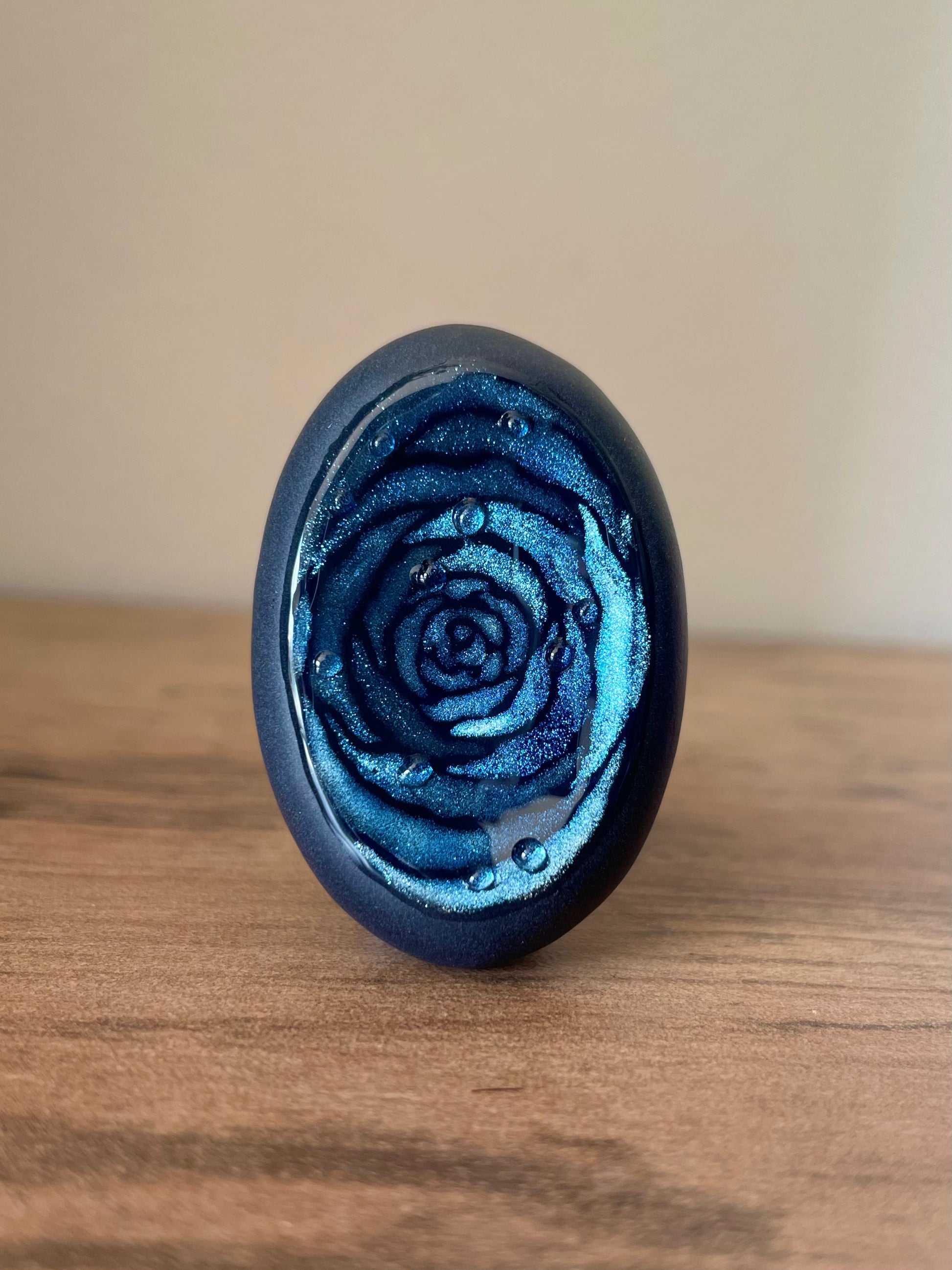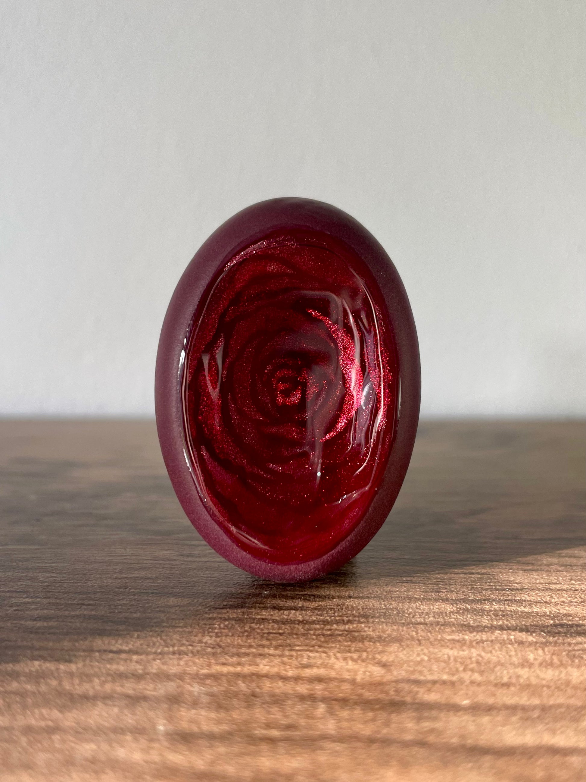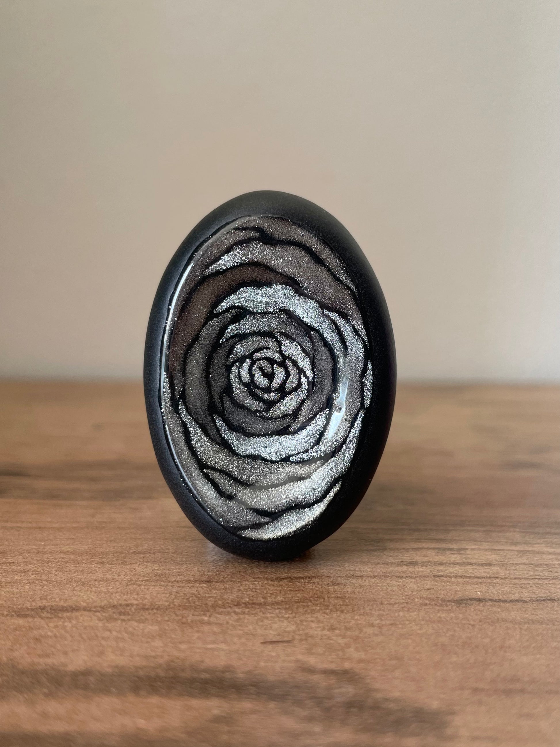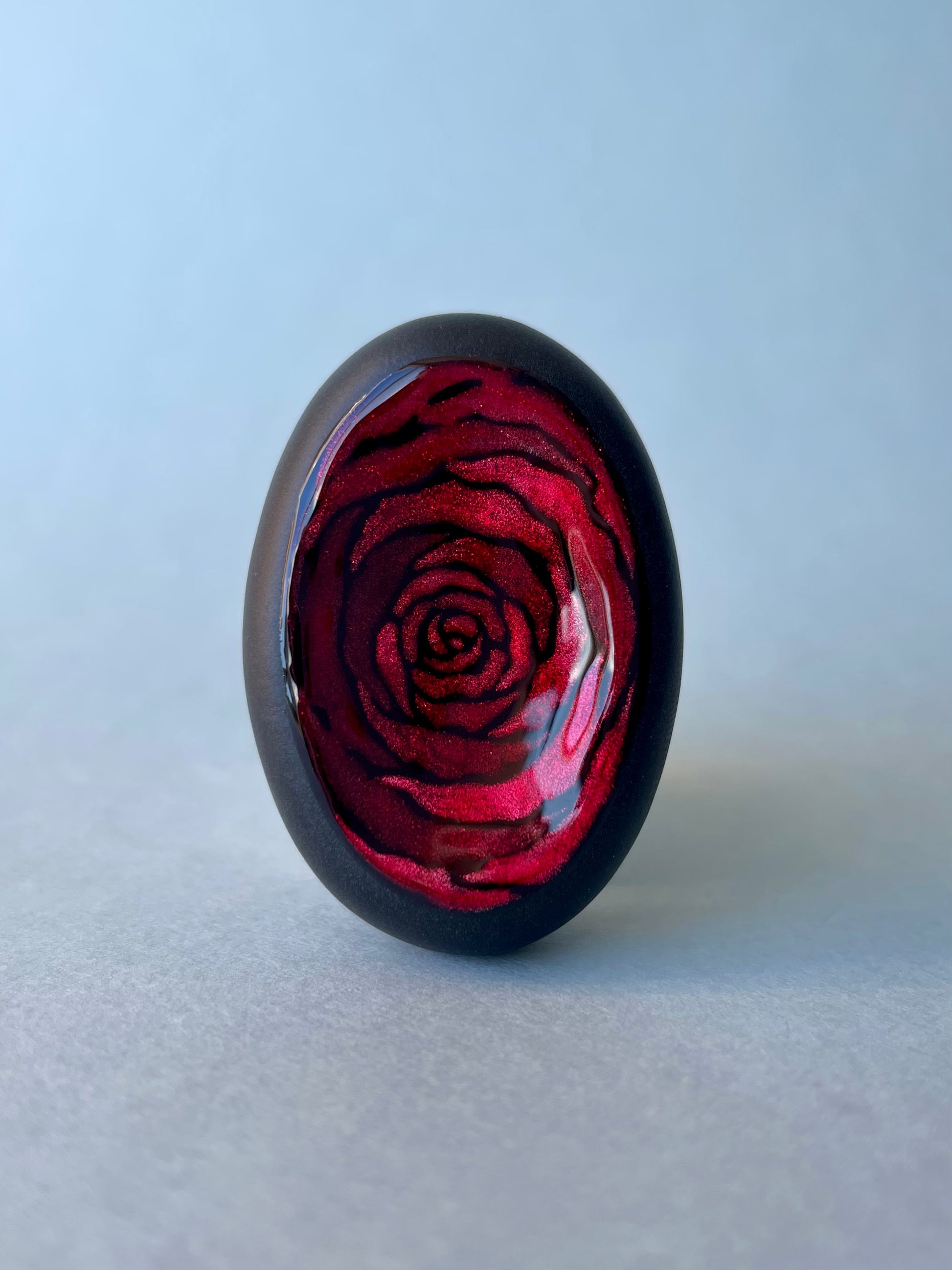 Ces pierres s’inspirent de la rose, de sa douceur et de sa profondeur. Chaque création est peinte à la main, avec un travail délicat autour des pétales et des nuances, pour évoquer la fleur sans la figer.